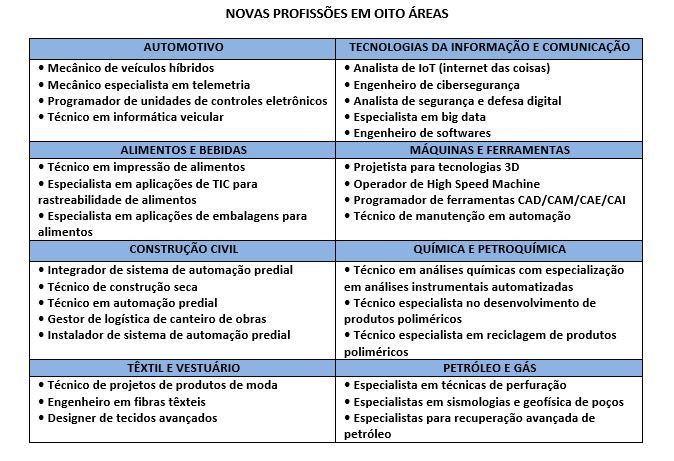 Existe a previsão de que 30 novas ocupações sejam criadas nos próximos cinco a dez anos, de acordo com SENAI (Serviõ de Aprendizagem Industrial). Oito áreas (Automotivo, Alimentos e Bebidas, Máquinas e Ferramentas, Petróleo e Gás, Têxtil e Vestuário, Química e Petroquímica, Tecnologias da Informação e Comunicação e Construção Cívil) devem sofrer os maiores impactos da indústria 4.0 e profissões como engenheiro de cibersegurança, técnico em informação e automação, mecânico de veículos híbridos e projetista para tecnologia 3D devem se consolidar no mercado.
