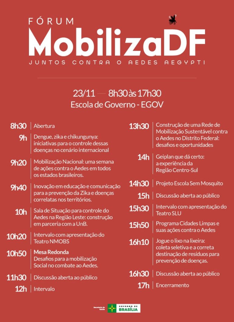 SEMANA DISTRITAL – O fórum será a abertura da “Semana Distrital de Mobilização contra a dengue e outras doenças transmitidas pelo Aedes”, que vai de 23 a 29 de novembro. O MobilizaDF marcará o Dia D de Combate ao Aedes no Distrito Federal em 2018.