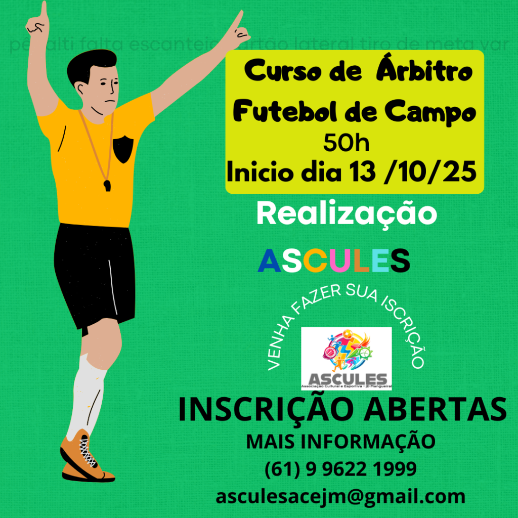 ✅ Ao final, você estará pronto para apitar jogos em diferentes categorias, com formação completa e certificada.Venha fazer parte dessa equipe! 🤝 asculesacejm@gmail.com (Contato; 61 9 9622 1999) https://docs.google.com/forms/d/e/1FAIpQLSctGDdTdNlk7FZ4ZPrkRs7gGVmLO3iA08lwjGQpHA_BPXcOcQ/viewform?usp=preview